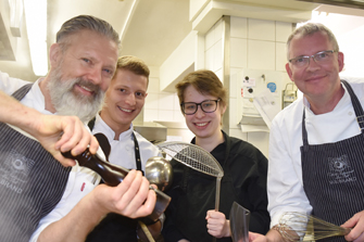 Feines bergisches Ambiente, edel eingedeckte Tische, genau wie man es erwarten kann; angenehm überrascht die freundliche Gastlichkeit. In der Küche werkelt der Meister und heißt den Gast mit Sülze von Nordsee-Krabben, einem cremigen Muschelsüppchen unter schwebender, frittierter Muschel willkommen. Die Vorspeise aus gebratenen Jakobsmuscheln auf einer Creme von Feldsalat und mit getupftem Gelee aus gelben Beeren ist zu einem köstlichen Kunstwerk auf edlem Porzellan arrangiert.